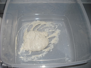 | first feed mixed together in dish is added to yesterday's starter in the box |