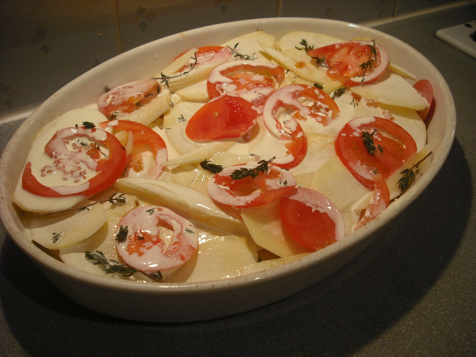 Repeat layering of potatoes and seasoning then top with tomatoes and a few sprigs of thyme, finishing off by pouring the rest of the cream on top.